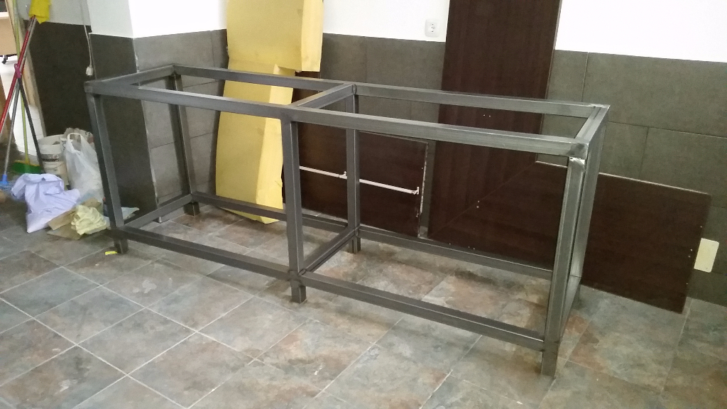 Esta es la mesa de acero que soportará el acuario. Está hecha con perfil cuadrado hueco de 50x50 mm. Las medidas son 2,30 m. x 0,60 m. (Largo x ancho). De altura se quedará al final sobre unos 93 cm. aproximadamente. Ahora mismo está en unos 92 cm. más o menos, pero me queda ponerle unos "tacos" de PVC ó creo que se llaman "conteras" de PVC.